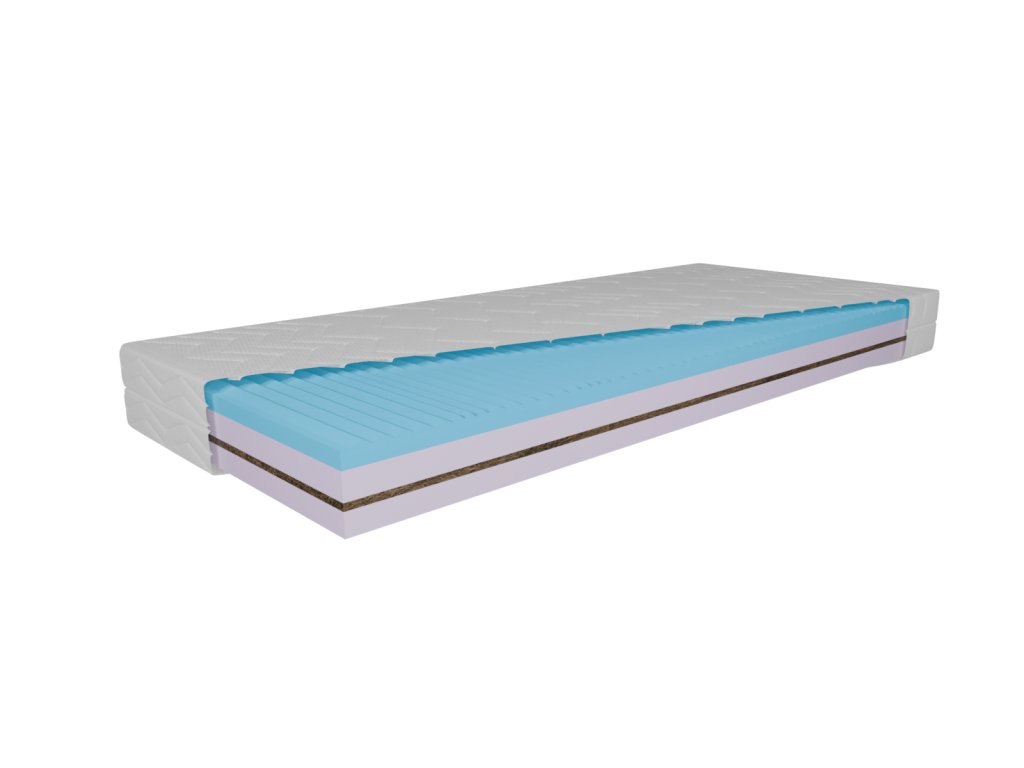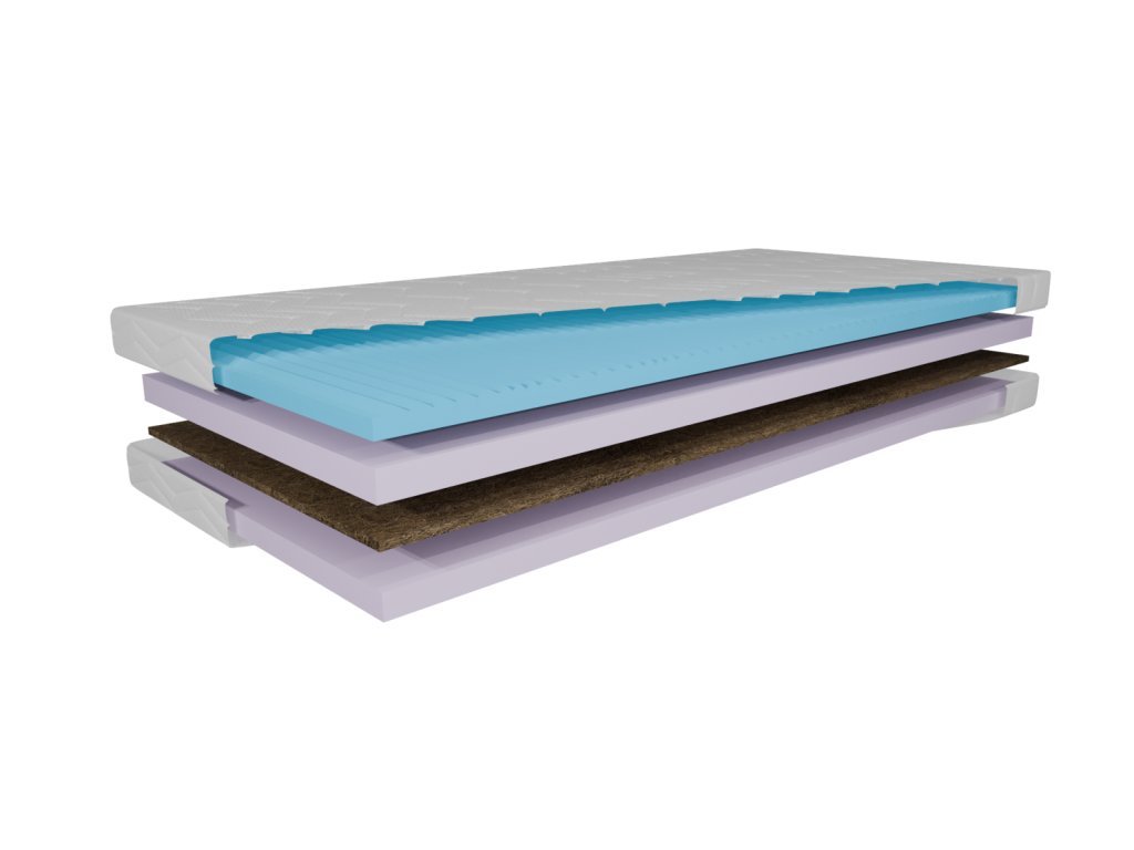 - Matrac v sendvičovej úprave so stranou hard a soft. V strede sa nachádza doska z prírodného kokosového vlákna, ktorá zabezpečí stále prevzdušnenie matraca a vyššiu tuhosť matraca. Nad ňou sa nachádza platňa z PUR peny strednej hustoty spolu s veľmi hrubou vrstvou komfortnej MEF peny, spodná strana je je tvrdšia PUR pena s profilom.